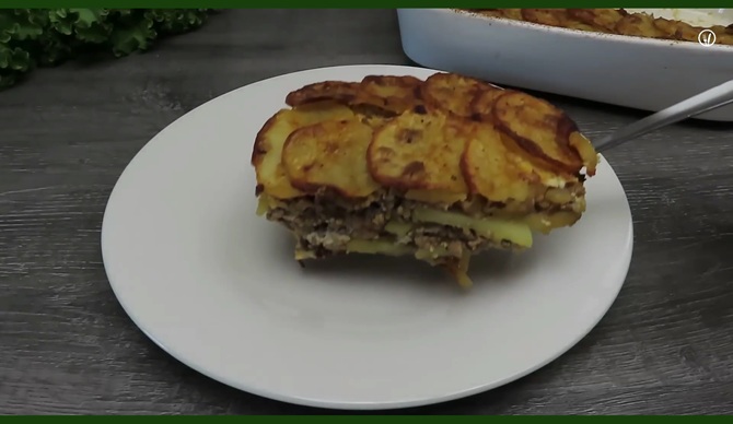 Na bešamelovú vrstvu ukladáme plátky zemiakov, potom mäso, ktoré polejeme omáčkou. Na mäso ukladáme zemiaky a na ne baklažán. Na baklažán nalejeme bešamel a dáme piecť pri teplote 200°C asi 30 minút.