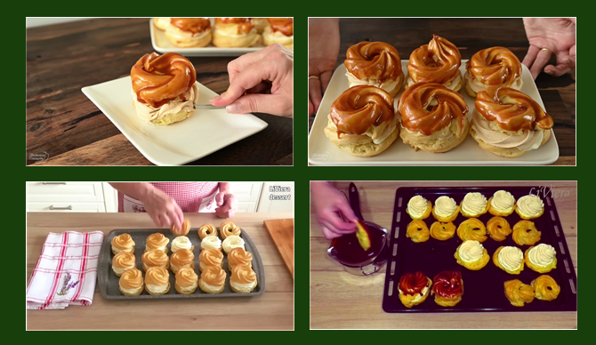 Vychladené veterníky opatrne prekrojte. Na spodnú časť nastriekajte žĺtkovú šľahačku, následne karamelovú.